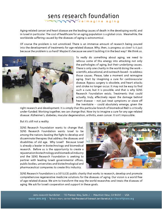 The conference gathered some of the foremost experts in Israel on biology of aging and longevity. Over 200 people attended. Special thanks go to Dr. Aubrey de Grey, Chief Science Officer of SENS Research Foundation, who was the guest of honor and key note speaker at the conference and the accompanying events of the Israel Science Day, on the special Invitation from the Ministry of Science.